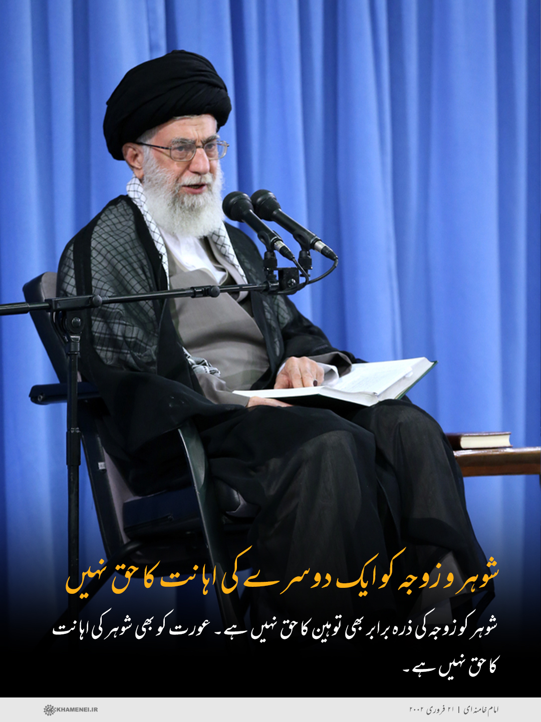 ظلم، امتیازی سلوک، توہین ہر حال میں غلط ہے۔ اگر آپ دنیا کے سب سے اچھے مرد ہوں اور آپ کی زوجہ مثال کے طور پر تعلیم اور معلومات کے لحاظ سے ایک کم تعلیم یافتہ خاتون ہو یا ایک نچلے طبقے کے گھرانے سے تعلق رکھتی ہو، تب بھی آپ کو اس پر ذرہ برابر بھی ظلم کرنے یا اس کی تھوڑی سی بھی توہین کرنے کا حق نہیں ہے، زوجہ وہی زوجہ ہے ابد تک کے لیے۔ شوہر کو زوجہ کی ذرہ برابر بھی توہین کا حق نہیں ہے۔ عورت کو بھی شوہر کی اہانت کا حق نہیں ہے۔ کبھی خاتون ایک پڑھی لکھی اور اعلیٰ تعلیم یافتہ عورت ہوتی ہے جس کی شادی مثال کے طور پر ایک مزدور سے ہوئي ہے۔ اسے بھی شوہر کی توہین و تذلیل کا حق نہیں ہے۔ مرد بہرحال اس کے لیے سہارا ہے۔ اسے اسی پر بھروسہ کرنا چاہیے۔