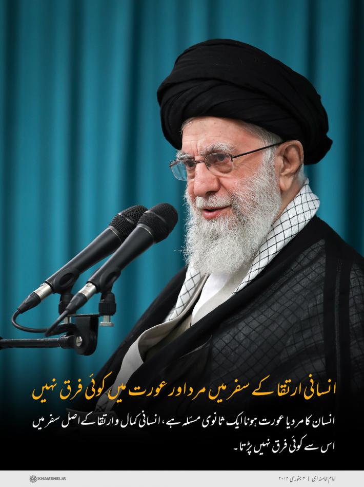 انسان کا مرد یا عورت ہونا ایک ثانوی مسئلہ ہے، ایک عارضی بات ہے جو صرف زندگی کے امور میں معنی و مفہوم پیدا کرتی ہے اور انسانی کمال و ارتقا کےاصل سفر میں اس سے کوئی فرق نہیں پڑتا۔ یہاں تک کہ ان کے کام بھی ایک دوسرے سے مختلف ہیں۔ اُس جوان کی مجاہدت و قربانی کا ثواب، جو اپنی جان ہتھیلی پر لیے میدان جنگ میں گیا ہو، اس کی بیوی کو دیا جاتا ہے کیونکہ بیوی کے کام کی زحمت و مشقت بھی اس سے کم نہیں ہے۔ ہم اگر چاہتے ہیں کہ یہ مرد معاشرے میں ایک مفید و کارآمد شخص ثابت ہو تو اس عورت کو بھی گھر کے اندر ایک اچھی بیوی ثابت ہونا پڑے گا ورنہ یہ چیز ممکن نہیں ہے۔